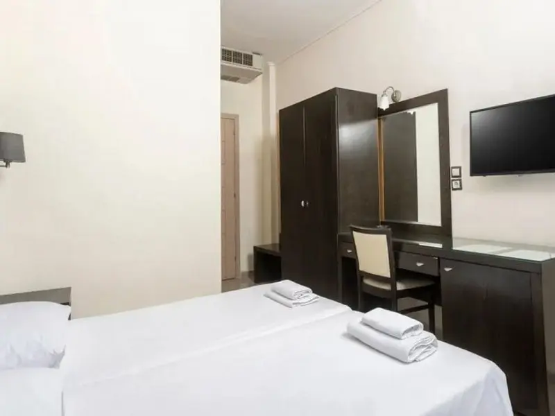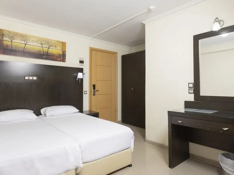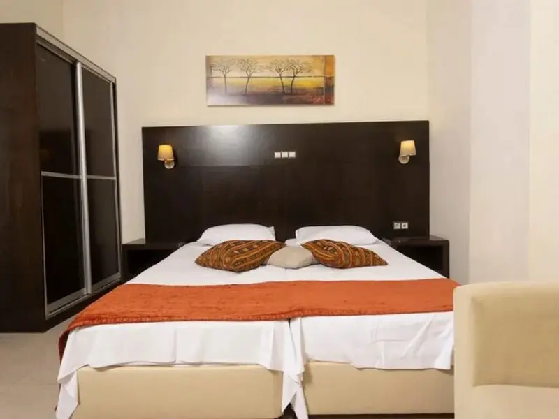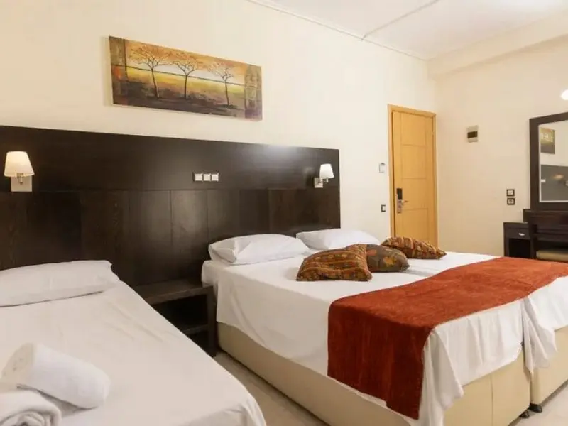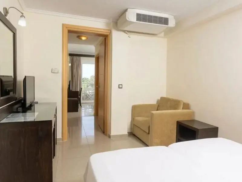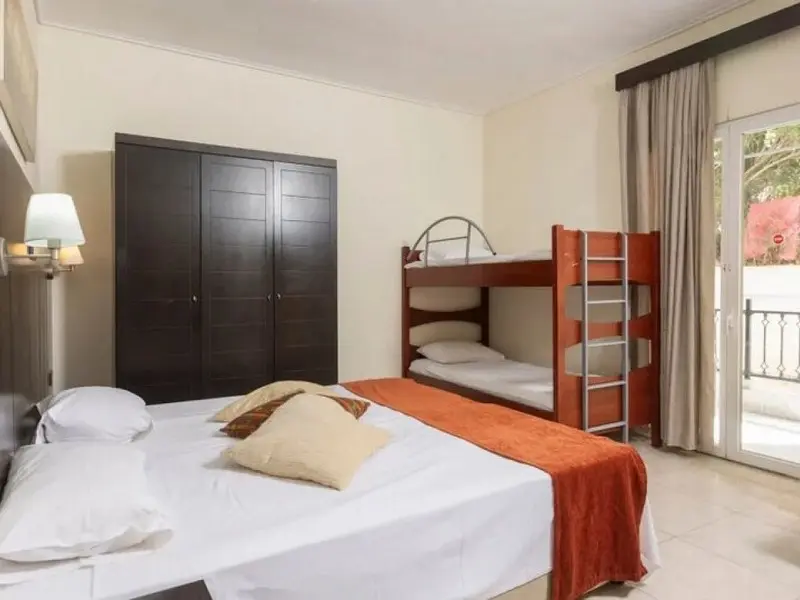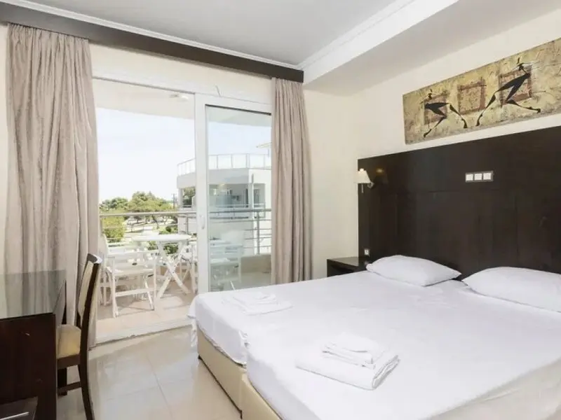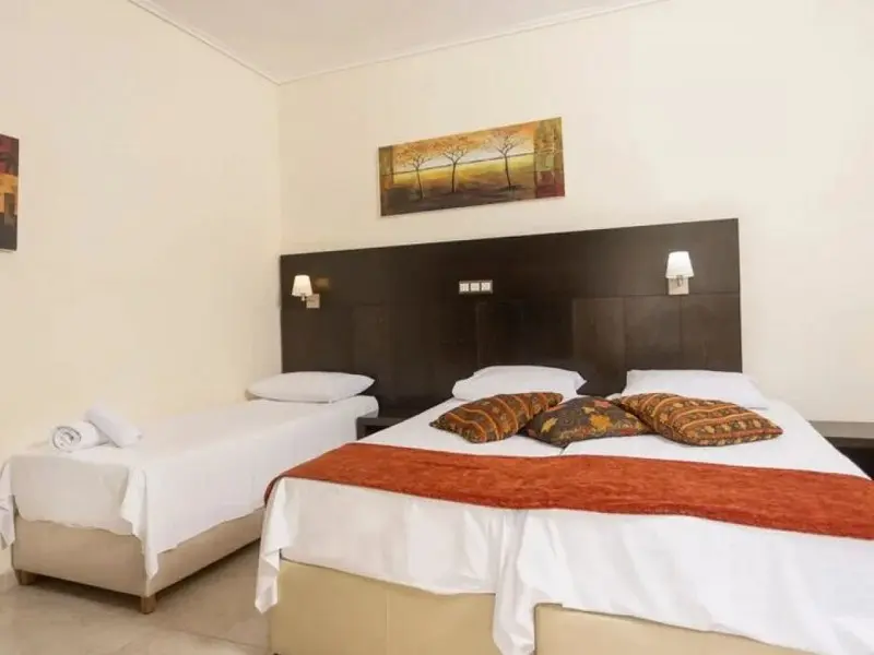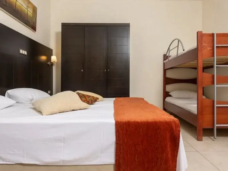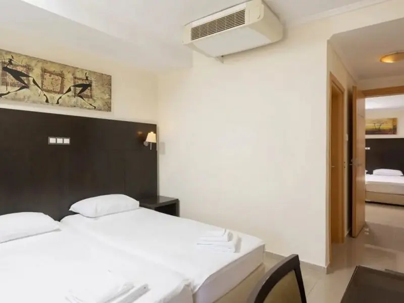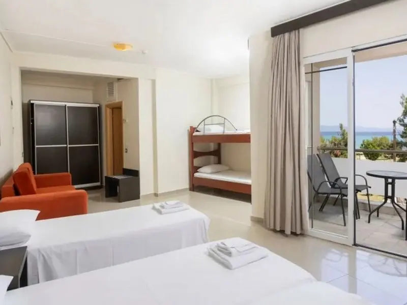 - Family Room 2Bedrooms-40 kvadratnih metara, smeštene u zgradi preko puta recepcije, imaju bračne ili dva odvojena kreveta u 2 međusobno povezane spavaće sobe, jedno kupatilo i jedan balkon sa pogledom na park Hanioti i more ili okolinu hotela, pogodne za 2-4 osobe.