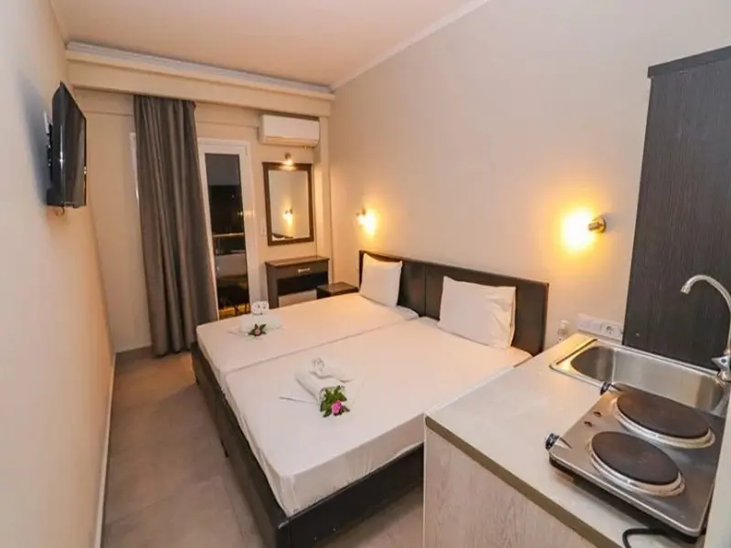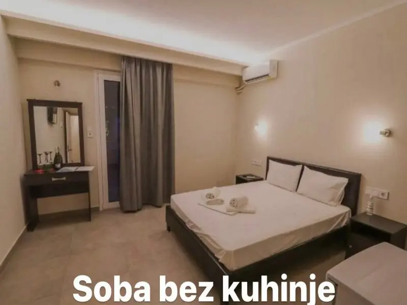 Sadržaj sobe: U ponudi imamo dvokrevetne i trokrevetne studije koji se nalaze u prizemlju, prvom, drugom i trećem spratu. Svi studiji opremljeni su čajnom kuhinjom ( posuđe i mini električni šporet) namenjenu za pripremu lakih obroka, kupatilom, klimom koja se doplaćuje 5eur dnevno, Wi-Fi internet i TV-om.