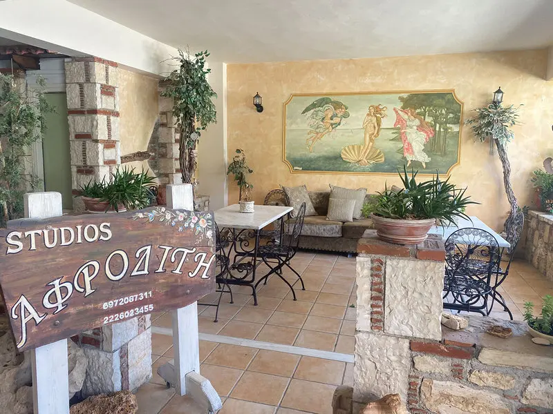 Vila Afrodita je smeštena u mirnom delu mesta, na samo nekoliko minuta hoda od centra. Od plaže je udaljena oko 300 metara. Sastoji se od studija koji su pažljivo dekorisani sa bezbroj detalja, dizajnirani u tradicionalnom grčkom stilu. Studiji su komforni i kompletno opremljeni (LCD-TV, klima uređaj, Wi-FI, kuhinja, terasa), tako da već godinama ispunjavaju sve zahteve gostiju. U prizemlju se nalazi salon sa garniturama za sedenje, koji izlazi na dvorište vile i na raspolaganju je gostima. Vila je namenjena gostima svih starosnih doba.