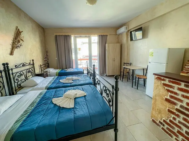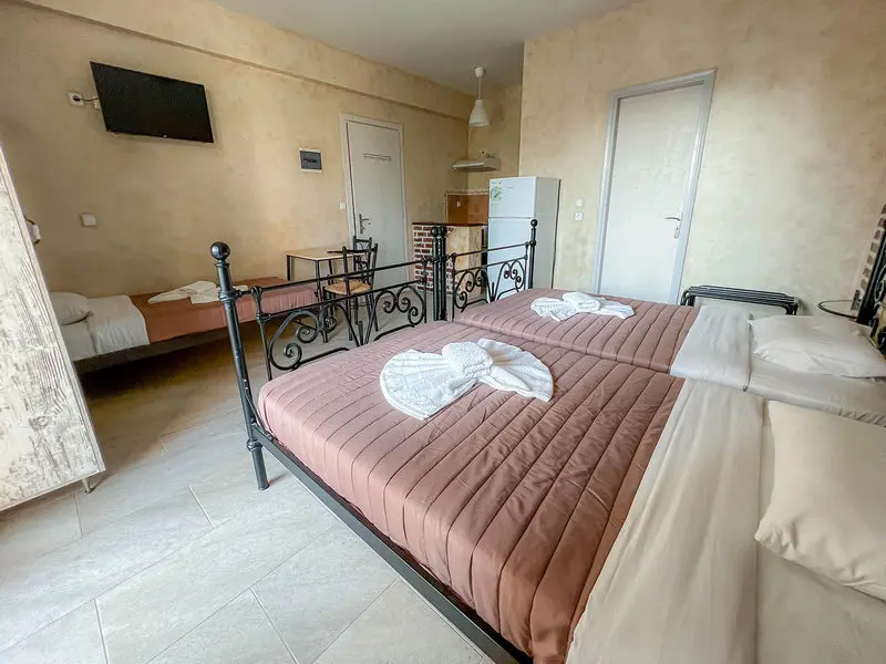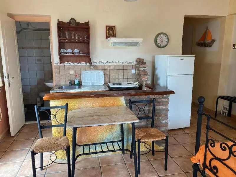 1/3 studio – u jednoj prostoriji se nalazi čajna kuhinja i jedan bračni i jedan običan ležaj (čije korišćenje nije uključeno u cenu i iznosi 5€ dnevno po smeštajnoj jedinici), (LCD-TV, klima uređaj, Wi-FI, kuhinja, terasa).