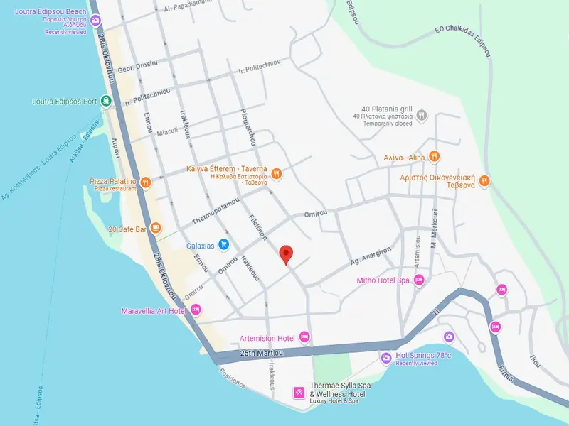 Vila Orion se nalazi u centralnom delu Edipsosa, udaljena oko 250 m od gradske plaže i oko 200 m od plaže sa termalnim izvorima. U blizini je javni parking, čije korišćenje je besplatno. Svi studiji sadrže spavaći deo, kuhinju sa trpezarijom, kupatilo, terase sa garniturom za sedenje. Sobe su klimatizovane (klima je uključena u cenu) i imaju TV. Vila ima WI-FI internet ( agencija nije odgovorna za kvalitet i brzinu ). Promena posteljine je na pola smene. Vila poseduje peškire. U blizini vile nalaze se mnogobrojni supermarketi, prodavnice, pekare i restorani, a glavno šetalište je na oko 300m od vile.