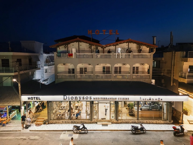 Hotel Dionisos nalazi se u centru Nei Porija, na samoj plaži. Raspolaže dvokrevetnim i trokrevetnim sobama i studijima. Sve sobe imaju terasu, sa pogledom na more ili na vrt.