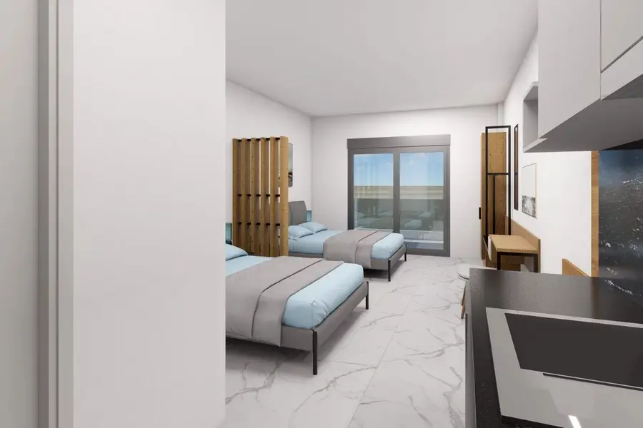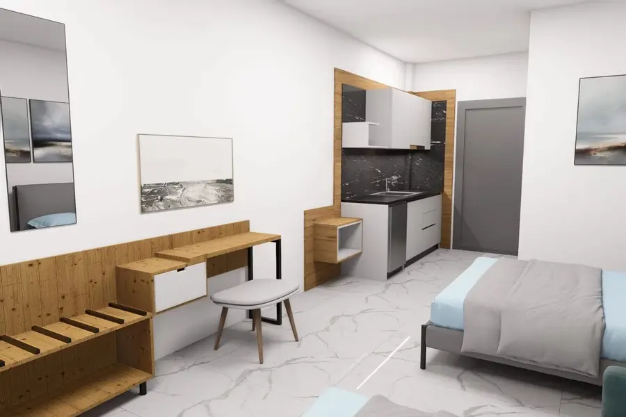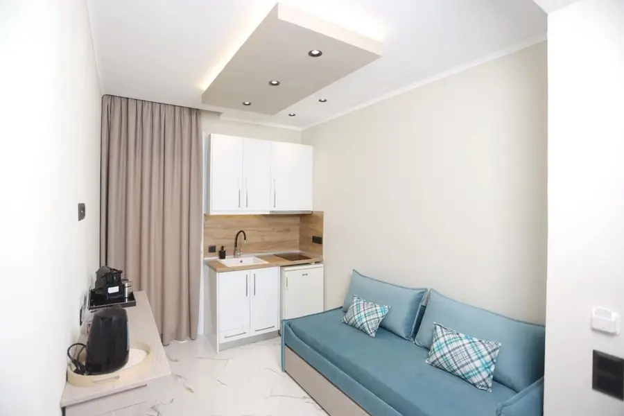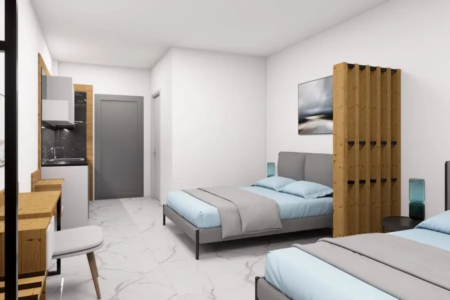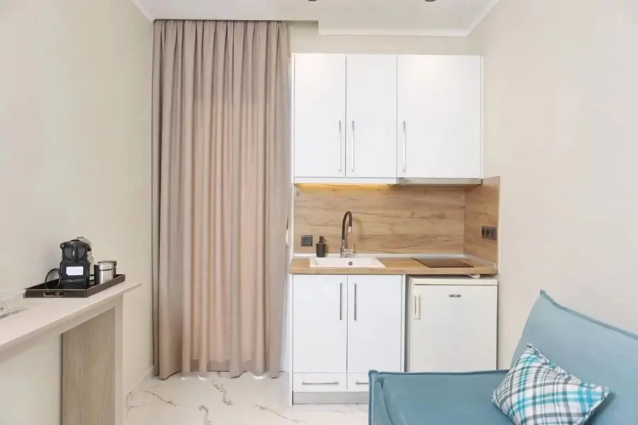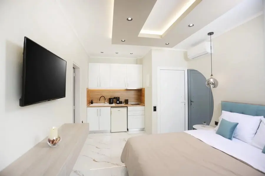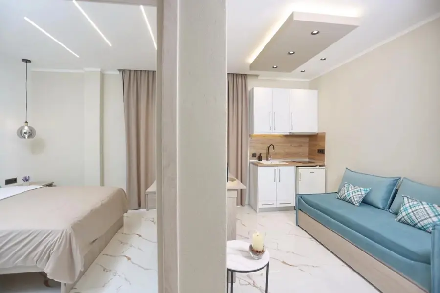 1/2, 1/3, 1/4 studio - smeštajna jedinica u vili u kojoj se u istom prostoru nalazi deo sa kuhinjskim elementima sa osnovnim priborom za jelo za odgovarajući broj osoba (prema broju ležajeva), kreveti, orman, kupatilo i terasa. 1/4 studio može da sadrži francuski ležaj (grčki standard) i krevet na sprat , 1/2 odnosno 1/3 studiji sadrže francuski ležaj i/ili singl ležaj (grčki standard).