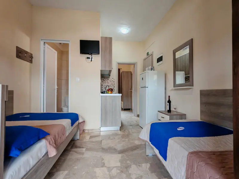 Vila Vasso nalazi se na oko 140m od mora, na uzvišenju pored crkve. Osim gradske plaže, u blizini je i jedna manja uvala sa stenama i peskom. Na drugom spratu nalaze se renovirani studiji i apartmani. Studio za 2-3 osobe ima pogled na celo mesto i u daljini more, dok trokrevetni studio i apartman gledaju ka bašti. Kuća ima signal za besplatan bežični internet, a smeštajne jedinice imaju TV i klima uređaj čije se korišćenje doplaćuje.